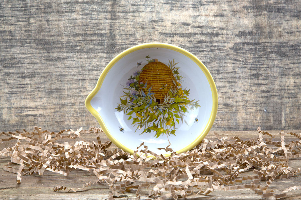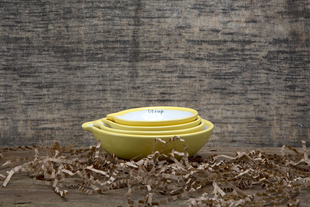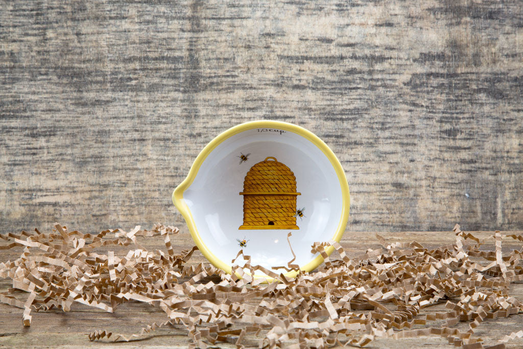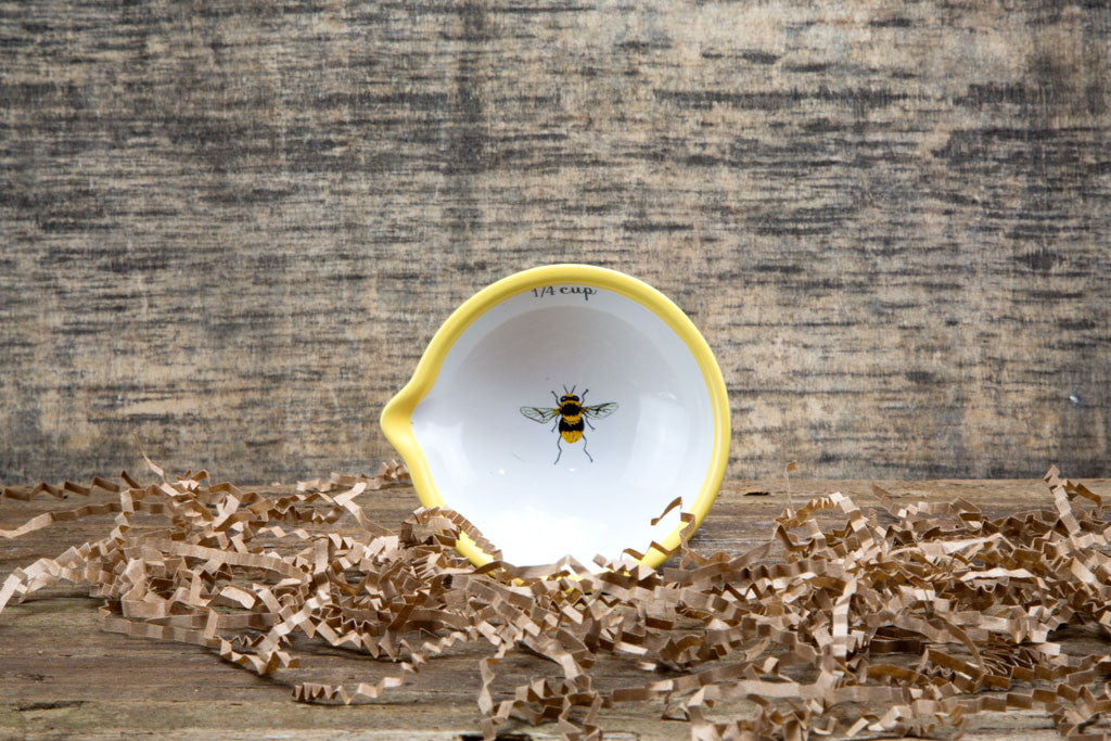 This ceramic measuring cup set includes four measuring cups (1/4 cup, 1/3 cup, 1/2 cup, 1 cup) with hand-painted honey bees scenes inside each. This measuring cup set would make a great housewarming gift!